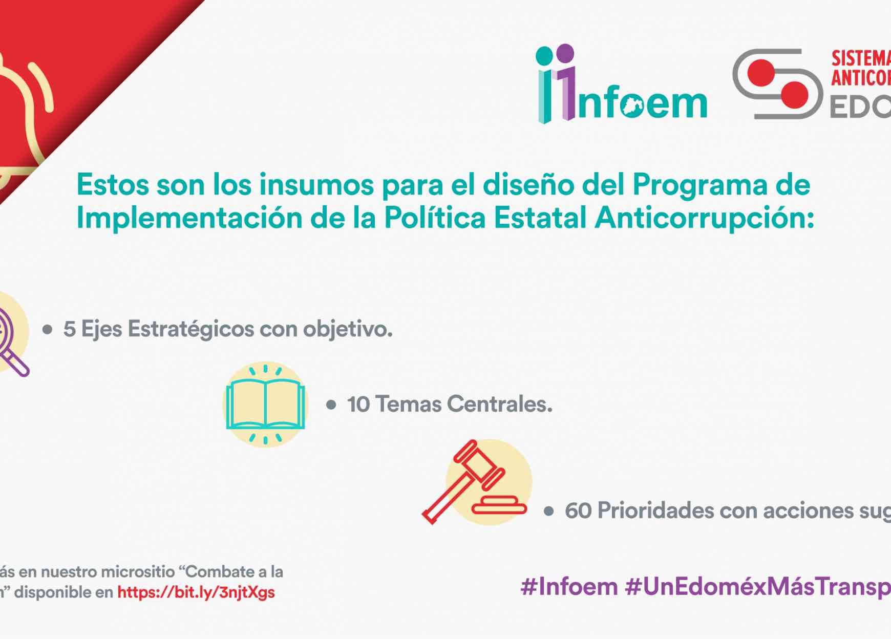 Con la aprobación de la Política Estatal Anticorrupción (PEA), el Comité Coordinador del Sistema Anticorrupción del Estado de México y Municipios del cual el Infoem forma parte, se da cumplimiento a uno de sus compromisos fundamentales, marcando un hito en el combate a la corrupción, se traduce en un mecanismo de acción en materia de fiscalización y control de los recursos públicos, de prevención, control y disuasión de faltas administrativas y hechos de corrupción, siendo el Estado de México la tercera entidad federativa en cumplir con esta tarea.