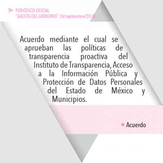 Acuerdo mediante el cual se aprueban las políticas de transparencia proactiva del Instituto de Transparencia, Acceso a la Información Pública y Protección de Datos Personales del Estado de México y Municipios. Acuerdo para la elaboración, presentación...