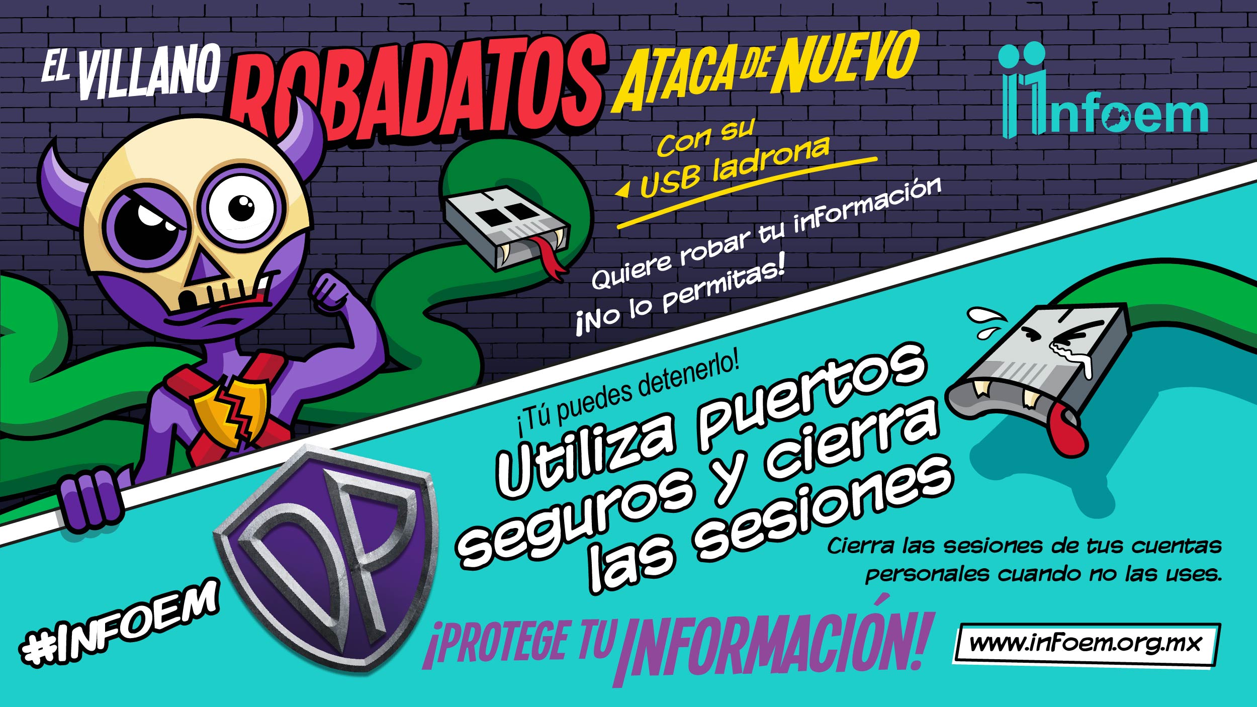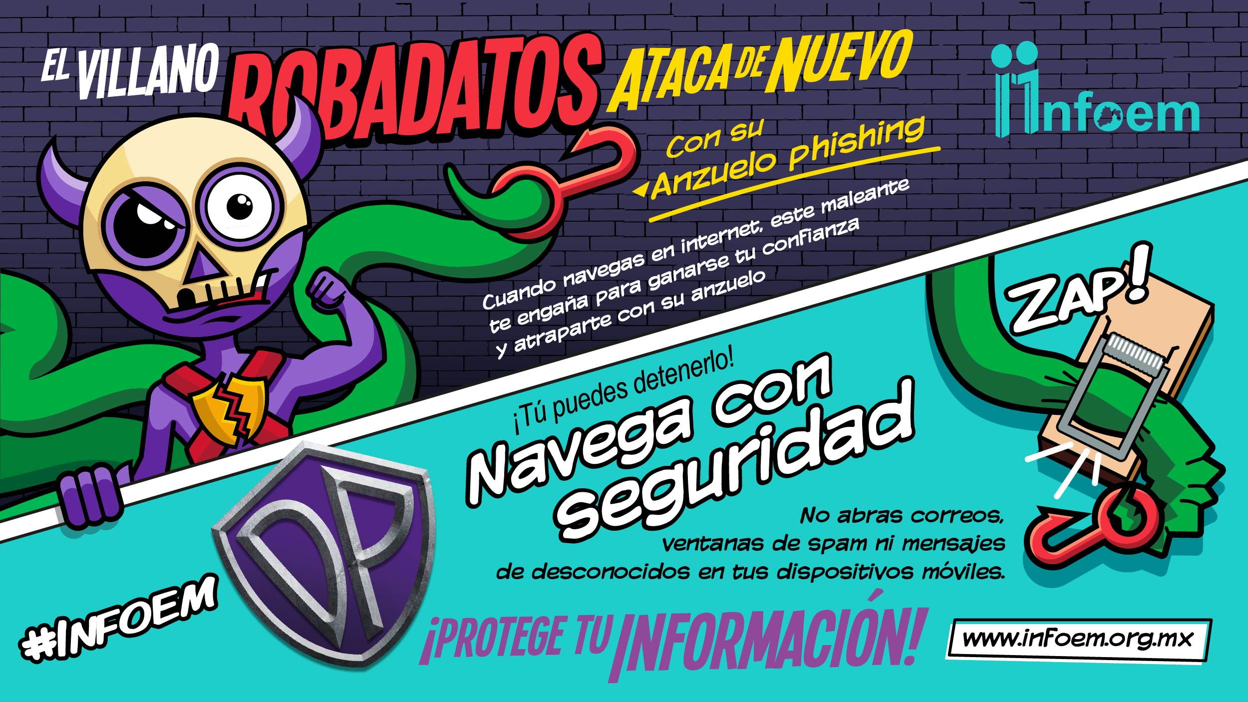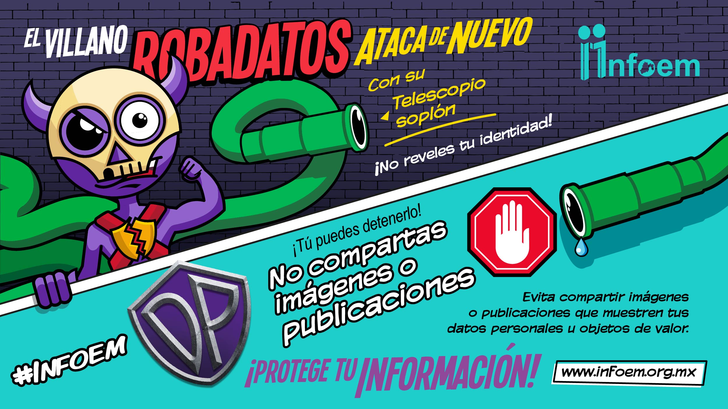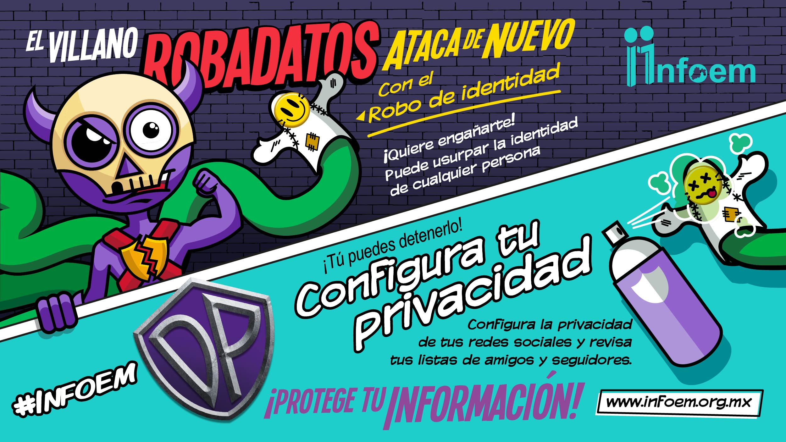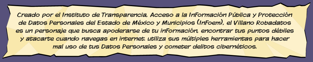Creado por el Instituto de Transparencia, Acceso a la Información Pública y Protección de Datos Personales del Estado de México y Municipios (Infoem), El Villano Robadatos es un personaje que busca apoderarse de tu información, encontrar tus puntos débiles y atacarte cuando navegas en internet. Utiliza sus múltiples herramientas para hacer mal uso de tus datos personales y utilizarlos para cometer delitos cibernéticos.