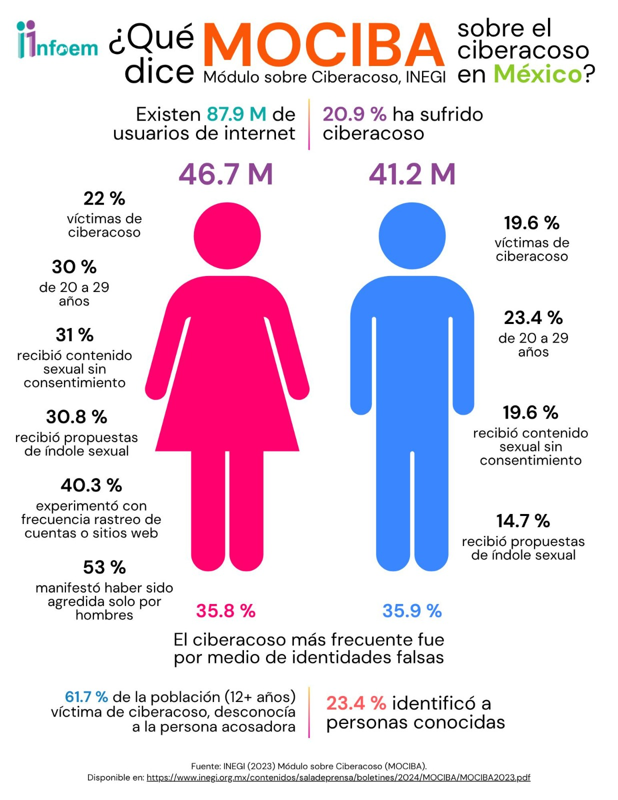 de la población de 12 años y más víctima de ciberacoso desconocía a la persona acosadora; 23.4 % identificó  a personas conocidas